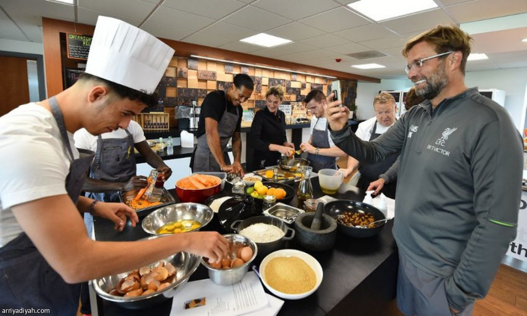 صورة التقطت للألماني كلوب مدرب ليفربول يلتقط صوراً للاعبين المعاقبين في المطبخ (المركز الإعلامي ـ ليفربول)