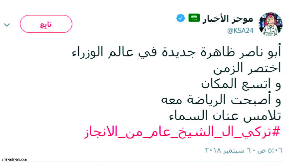 تفاعل نحو 7 ملايين مستخدم لموقع التواصل الاجتماعي "تويتر" مع هاشتاق #تركيآلالشيخعاممن_الإنجاز، الذي انطلق بعد مضي عام واحد على تعيين تركي آل الشيخ رئيساً لمجلس إدارة الهيئة العامة للرياضة، وبعد الأحداث الكثيرة التي شهدتها هيئة الرياضة خلال هذا العام، وتنوعت ما بين اتفاقيات وبرامج وبطولات عالمية كبرى، تعكس الحراك الكبير الذي شهدته هيئة الرياضة خلال 365 يوماً من العمل والمتابعة المتواصلة.