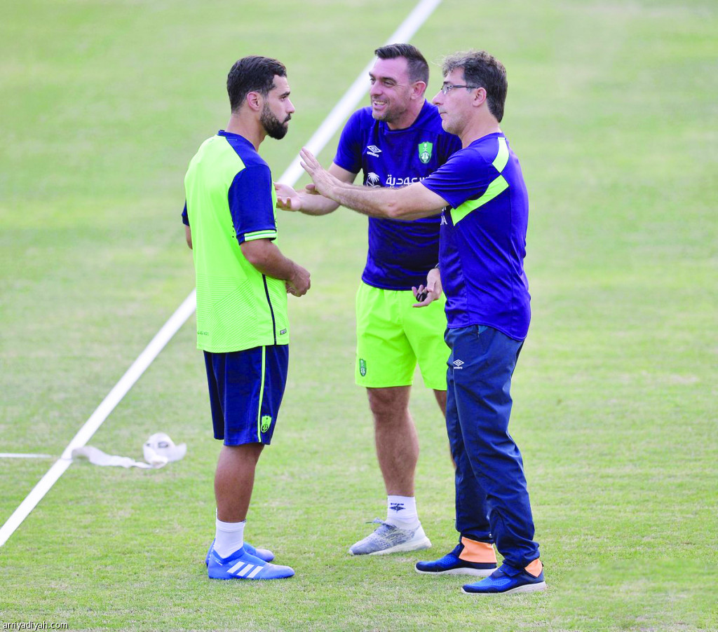 صورة التقطت أمس للأرجنتيني بابلو جويدي مدرب فريق الأهلي الأول لكرة القدم يتحدث خلال الحصة التدريبية الاعتيادية مع المصري عبد الله السعيد صانع الألعاب العائد بعد تعافيه من إصابة عضلية أبعدته عن انطلاقة الموسم الجديد (المركز الإعلامي ـ الأهلي)