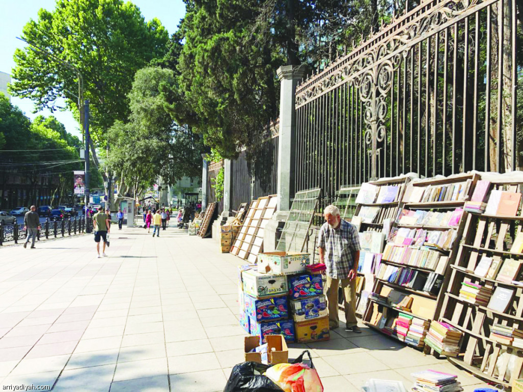 صورة التقطت لرومان يعرض كتبه المستعملة على أحد أسوار العاصمة الجورجية (الرياضية)