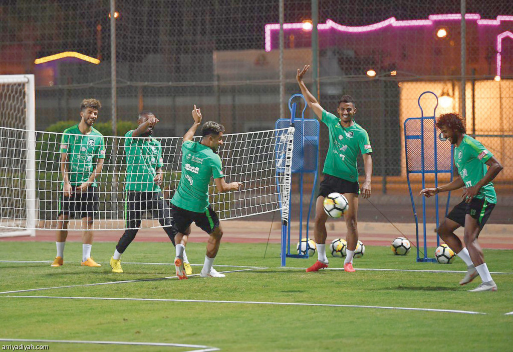 صورة التقطت أمس لياسر الشهراني ووليد باخشوين وهتان باهبري وإبراهيم غالب وعبد الرحمن العبود لاعبي المنتخب السعودي يتبادلون الكرة فوق الشبكة (المركز الإعلامي ـ اتحاد الكرة)
