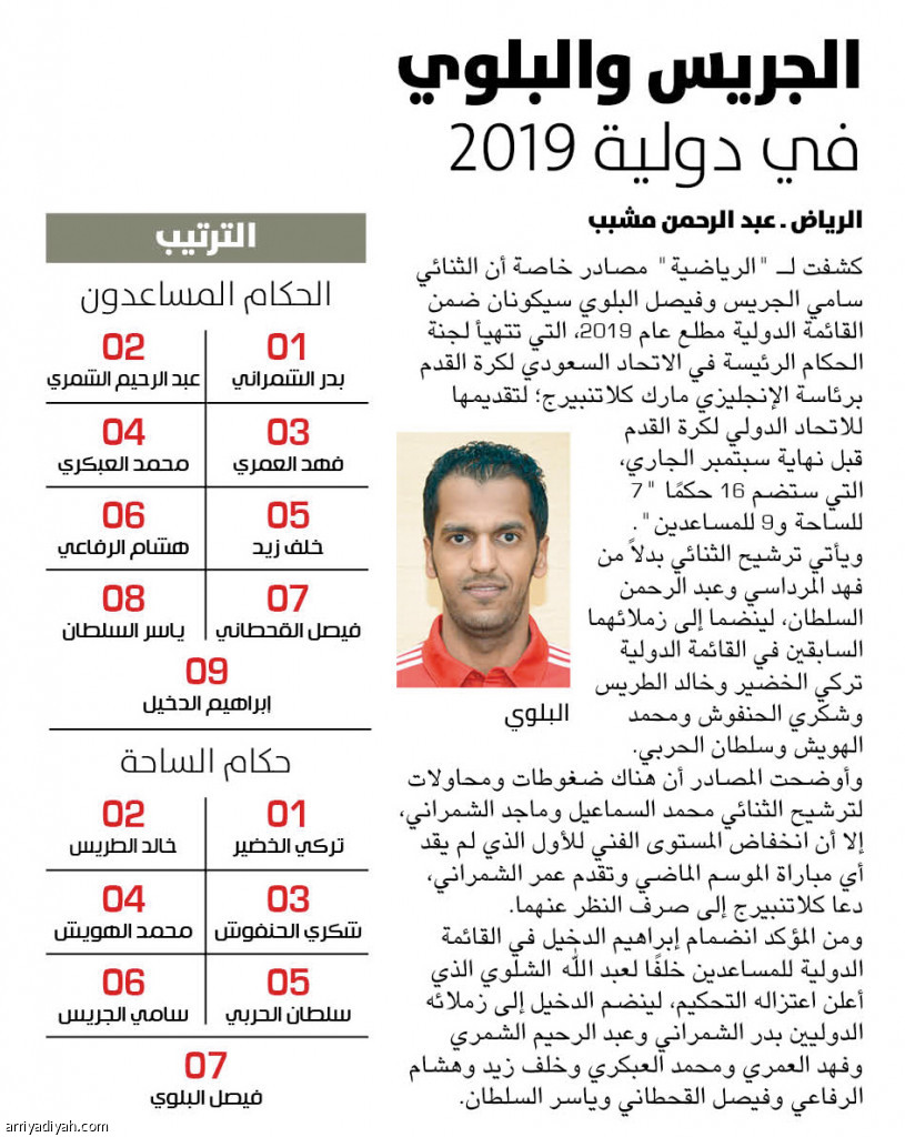 وبحسب مصادر خاصة بـ "الرياضية"، تعد مشاركة الجريس والبلوي في هذا التجمع أحد أهم مسوغات ترشيحهم للحصول على الشارة الدولية لعام 2019 بدلا من فهد المرداسي وعبد الرحمن السلطان.