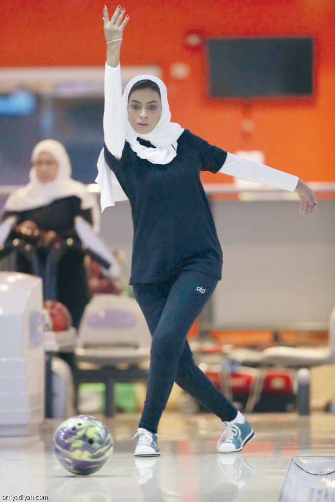 أطلقت دانة الفرج لاعبة البولينج ذراعها في الهواء بعد أن أطلقت كرتها ولاحقتها بنظرات عينيها في انتظار إصابة الهدف خلال الحصة التدريبية أمس في ختام الدورة الخاصة بفريق سيدات البولينج المكون من 13 لاعبة سعودية.. في صالة القصيبي الرياضية النسائية تحت إشراف اتحاد اللعبة وخضعت اللاعبات السعوديات إلى دورة تدريبية مكثفة طوال الأسبوع الماضي لمدة ثلاث ساعات يومية، إضافة إلى نقاشات حول اللعبة والأداء ومعرفة قانون البولينج، وتدريبات لياقية لأول فريق نسائي سعودي للبولينج. تصوير: عيسى الدبيسي