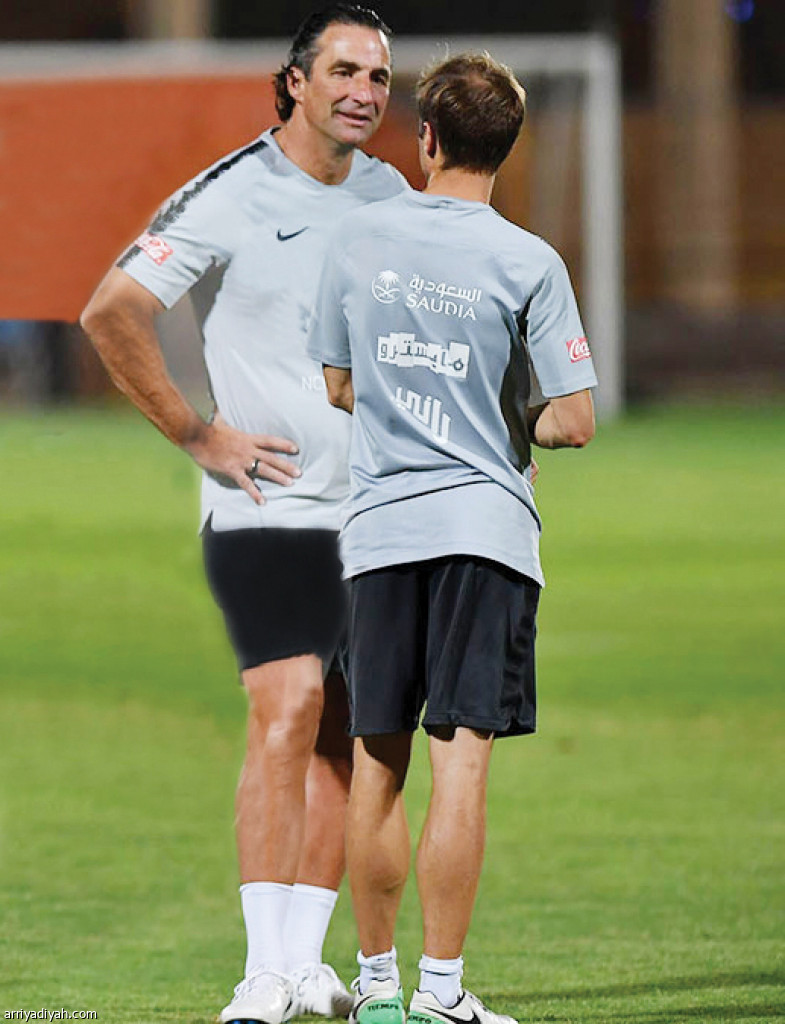 صورة التقطت أمس للأرجنتيني خوان بيتزي مدرب المنتخب السعودي الأول لكرة القدم خلال حديثه مع أحد مساعديه في الحصة التدريبية التي جرت على ملعب الأمير فيصل بن فهد في مدينة الرياض في إطار التحضيرات لخوض المباراة الودية أمام بوليفيا اليوم (المركز الاعلامي ـ الاتحاد السعودي)