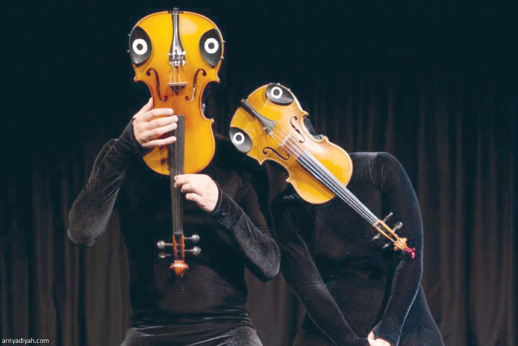 صورة التقطت لبطلين من مسرحية "أنت وأنا" يرتديان أقنعة أدوات موسيقية خلال العرض الصامت في المهرجان (رويترز)