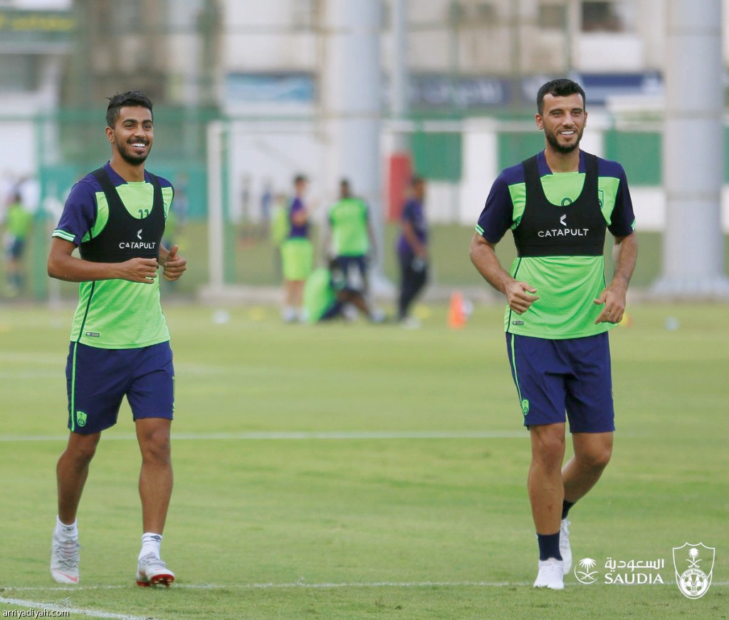 صورة التقطت أمس للسوري عمر السومة وحسين المقهوي بعد انتظامهما في تدريبات الأهلي أمس (المركز الإعلامي ـ الأهلي)