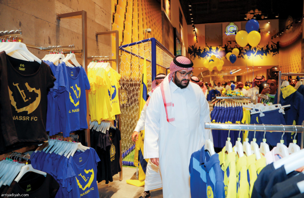 صورة التقطت أمس لسعود السويلم رئيس نادي النصر يتجول في متجر النادي الواقع في حي المروج شمال مدينة الرياض بعد عملية التدشين الرسمية لقميص الفريق الأول تصوير: بشير صالح