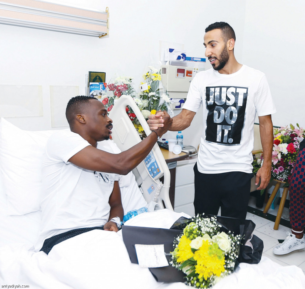 صورة التقطت أمس لمعتز هوساوي يصافح من على السرير الأبيض في مستشفى عرفان نوح الموسى زميله في فريق الأهلي الأول لكرة القدم.. وزار لاعبو الفريق ومسؤولون في النادي هوساوي في المستشفى ووعدوه بالفوز على فريق الحزم وإهداء النقاط الثلاث إليه تصوير: عبد الوهاب خبتي