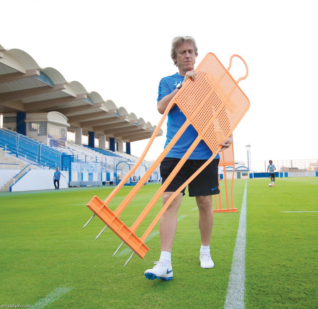 صورة التقطت أمس للبرتغالي خيسوس مدرب فريق الهلال الأول لكرة القدم يحمل الحاجز المتحرك بكلتا يديه خلال التدريب الذي أجري عصر أمس الأحد في مقر النادي استعدادًا لمواجهة الفتح الليلة (المركز الإعلامي ـ الهلال)