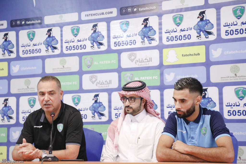 صورة التقطت أمس لفتحي الجبال مدرب فريق الفتح خلال المؤتمر الصحفي ويظهر بجانبه المنسق الإعلامي للنادي (المركز الإعلامي ـ الفتح)