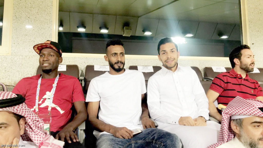 صورة التقطت أمس للبرازيلي بيتروس مرتديًا الثوب السعودي في منصة الملعب وإلى جواره عبد الله العويشير وعمر هوساوي تصوير: بشير صالح