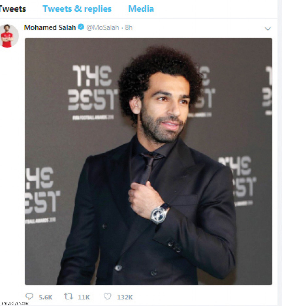 نشر المصري محمد صلاح نجم فريق ليفربول الإنجليزي الأول لكرة القدم في حسابه على “تويتر” صورته خلال حضوره حفل توزيع جوائز الاتحاد الدولي لكرة القدم. صلاح فاز بجائزة أفضل هداف وكان الثالث على ترتيب أفضل لاعبي العالم. الصورة لاقت تفاعلاً كبيراً إذ شارك بالتعليق أكثر من 5 آلاف وأعيد تغريدها 9.9 ألف مرة فيما لاقت إعجاب 120 ألفاً.
