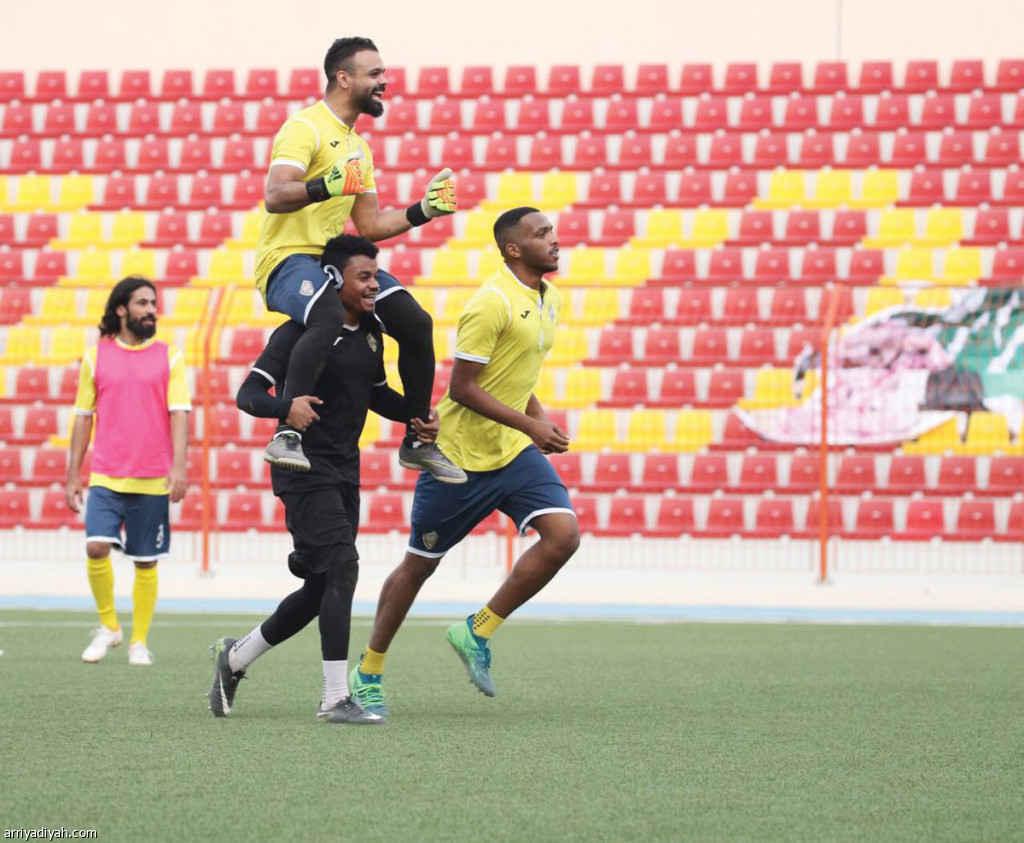 صورة التقطت أمس لحارس مرمى أحد يحمل زميله أسامة عاشور خلال التدريبات ويبدو حسين عبد الغني قائد الفريق والغاني كارلوس أوهين (المركز الإعلامي ـ أحد)