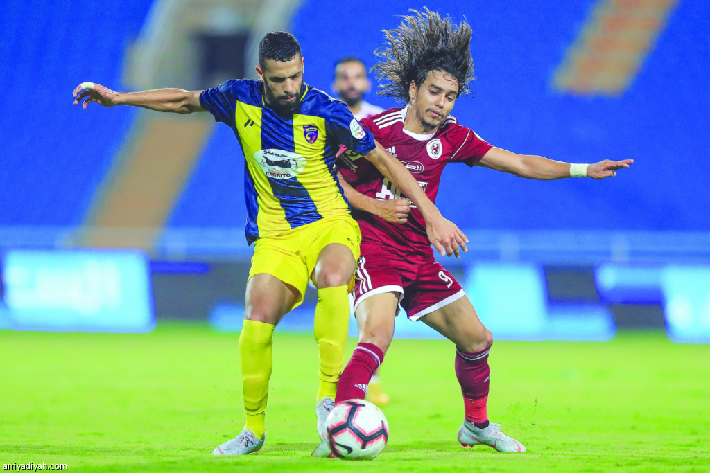 صورة التقطت أمس للبرازيلي روجيرو لاعب الفيصلي وسيف بن حسين لاعب الحزم يتنافسان على الكرة خلال مباراة الفريقين التي انتهت حزماوية 2ـ1 تصوير: فهد الضويفري