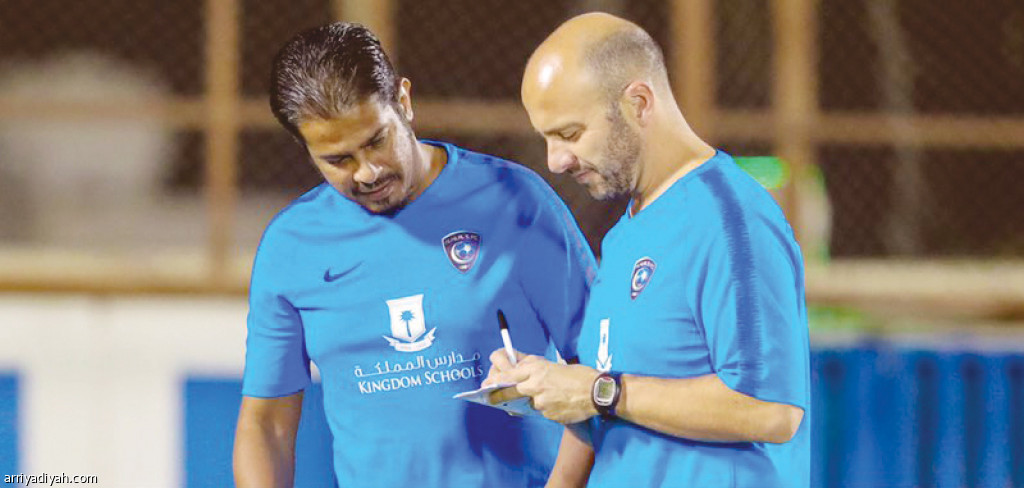 صورة التقطت للبرتغالي رودولفو كوستا مدرب الهلال "ب" يتحدث إلى تركي الشايع المدرب المساعد في جهاز الفريق الأول والمكلف بمهام فنية مع الفريق "ب" (المركز الإعلامي ـ الهلال)
