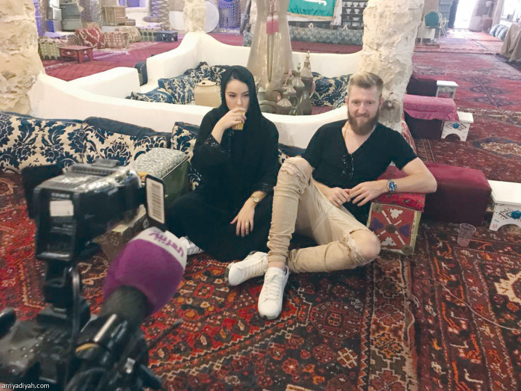 صورة التقطت أمس للبرازيلي فاجنر أليماو مدافع فريق الحزم وزوجته أثناء مقابلة تلفزيونية مع قناة العربية من داخل قرية تراثية في الرس.. وتذاع المقابلة خلال الأسبوع الجاري تصوير: فهد البطاح