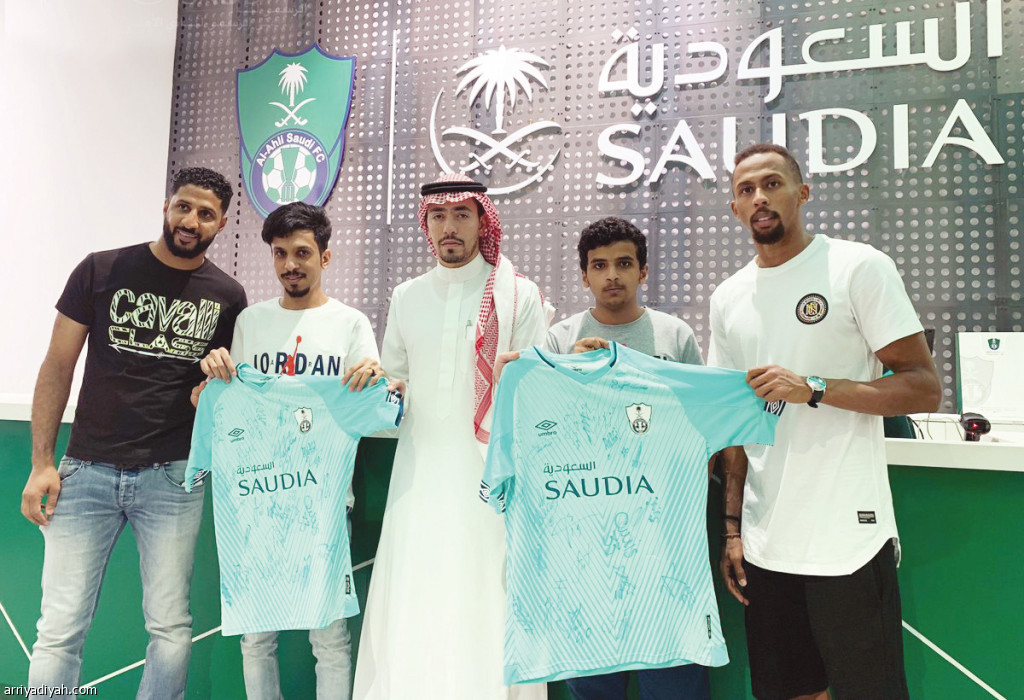 صورة التقطت لعبدالله بترجي واللاعبين سعيد المولد وياسر المسيليم مع الفائزين بمسابقة ادعم ناديك (المركز الإعلامي ـ الأهلي)