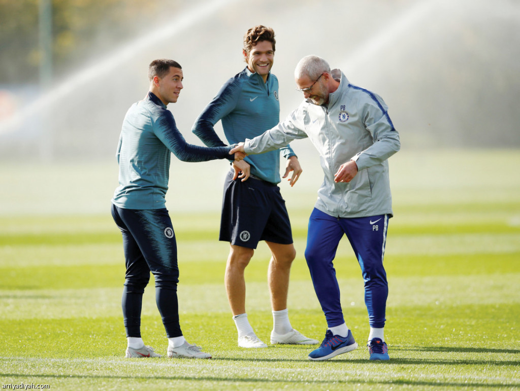 صورة التقطت أمس لـ إيدن هازارد وماركوس ألنسو و باولو بيرتيلي مدرب اللياقة البدنية أثناء التدريب (الفرنسية)