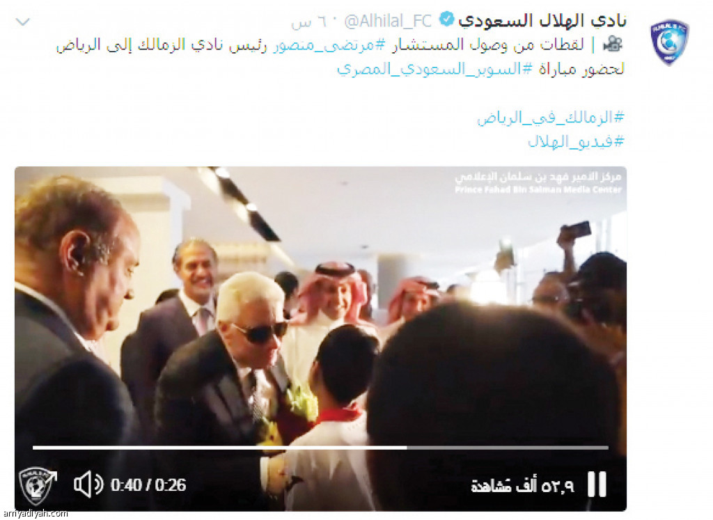 نشر حساب نادي الهلال الرسمي في موقع التواصل الاجتماعي "تويتر" مقطع فيديو احتوى على لقطات من وصول المستشار مرتضى منصور رئيس نادي الزمالك إلى الرياض لحضور مباراة السوبر السعودي المصري. ونال مقطع الفيديو خلال 6 ساعات من نشره على 52 ألفاً و914 مشاهدة.