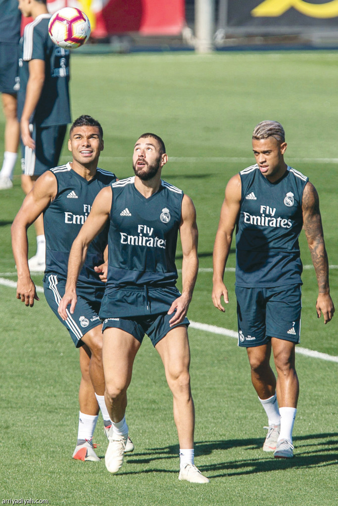صورة التقطت أمس للفرنسي كريم بنزيمة والإسباني ماريانو دياز والبرازيلي كاسميرو لاعبي الريال خلال التدريبات استعداداً لمواجهة ألافيس اليوم ضمن الدوري الإسباني(الأوروبية)