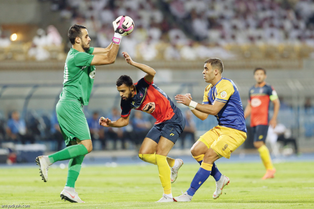 صورة التقطت أمس لحارس مرمى الحزم يلتقط الكرة قبل أن تصل للمغربي حمدالله لاعب فريق النصر