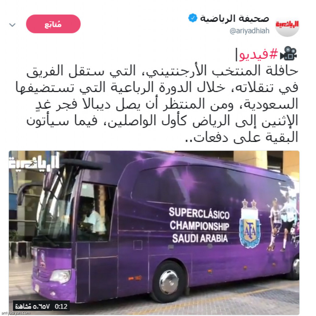 وغردت "الرياضية" بمقطع الفيديو لحافلة المنتخب الأرجنتيني، التي ستقل الفريق في تنقلاته، خلال الدورة الرباعية التي تستضيفها السعودية، وأضافت "الرياضية" في التغريدة أنه من المنتظر أن يصل ديبالا مهاجم يوفنتوس الإيطالي فجر اليوم الإثنين إلى الرياض كأول الواصلين، فيما سيأتي الباقون على دفعات.