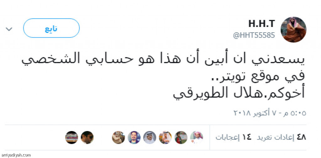 بدأ هلال الطويرقي الرياضي المعروف وأحد أبرز الداعمين لأندية المنطقة الشرقية في تفعيل حسـابه الشخصي على موقع التواصل الاجتماعي "تويتر" والذي دشنه في مارس الماضي 2018. وكتب الطويرقي أمس في تغريدة: "يسعدني أن أبين أن هذا هو حسابي الشخصي في موقع تويتر.. أخوكم هلال الطويرقي". ولم يحمل حساب الطويرقي اسمه الشخصي بل حمل اختصار الاسم باللغة الإنجليزية H.H.T.