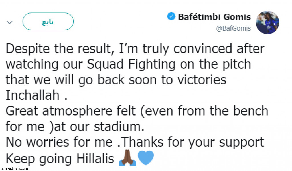 وكتب جوميز عبر حسابه في "تويتر" قائلا: "على الرغم من خسارة فريقنا للقب، أنا واثق من عودتنا إلى الانتصارات قريباً ـ إن شاء الله ـ بعد مشاهدة قتال فريقنا في الملعب، رأيت من مقاعد البدلاء الأجواء الحماسية".