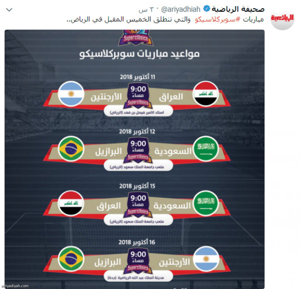 تفاعل نحو 5 ملايين مع هاشتاق #سوبركلاسيكو الخاص بالدورة الرباعية الدولية التي تحتضنها الرياض اعتباراً من الخميس المقبل بمشاركة منتخبات الأرجنتين والبرازيل والعراق إلى جانب المنتخب السعودي.