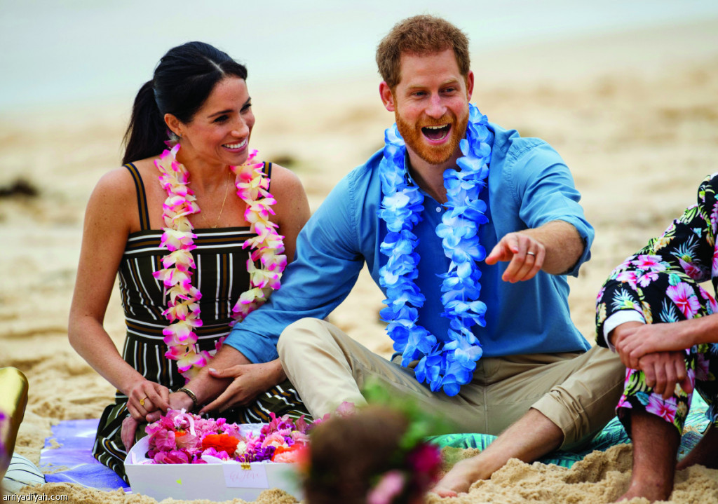 صورة التقطت أمس للأمير هاري حفيد ملكة بريطانيا ونجل الأمير تشارلز ولي العهد برفقة الأمريكية ميجان ماركل زوجته خلال لقاء على شاطئ بوندي في مدينة سيدني الأسترالية مع أعضاء مجموعة محلية باسم "موج واحد" تعنى برفع الوعي بالصحة العقلية.. وكان هاري وماركل بدآ قبل 4 أيام رحلة مدتها 16 يومًا في أستراليا والمحيط الجنوبي الهادي (أسوشيتد برس)