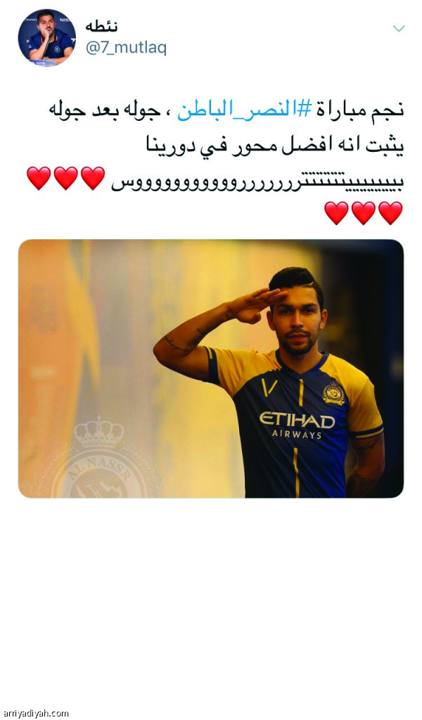وجاءت صورة البرازيلي بيتروس الأكثر تداولًا في الهاشتاق بعد المستوى المميز الذي قدمه في المواجهة، على حد وصف جماهير النادي العاصمي. يذكر أن النصر واصل صدارة الدوري برصيد 18 نقطة من ستة انتصارات.