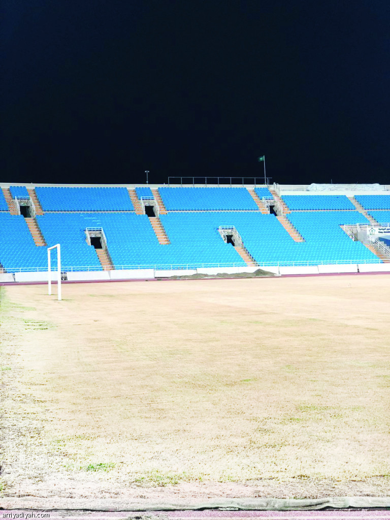 وبدت أرضية الملعب صفراء، في الصورة التي التقطها أمس الزميل عبد العزيز السعودي، بعد إزالة طبقة العشب الطبيعي، مع بدء أعمال الزراعة، التي تنفذها شركة سعودية خاصة.