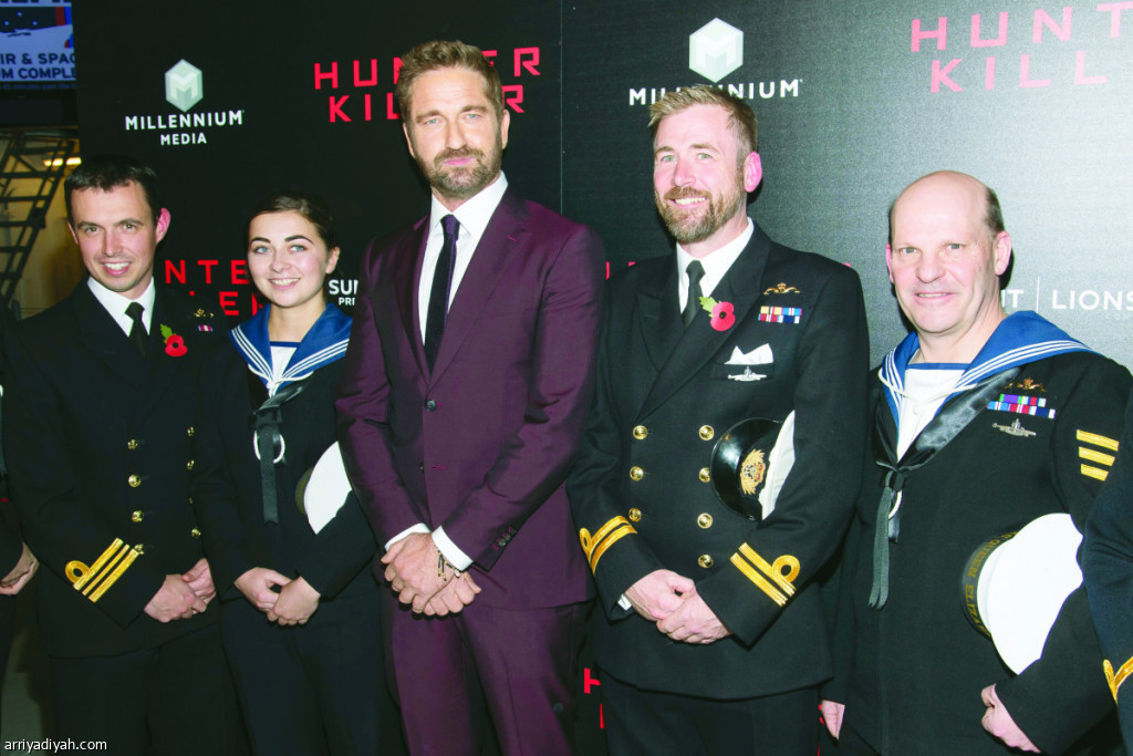 صورة التقطت أمس لجيرارد باتلر الممثل الإسكتلندي مع بحارة من السفينة الملكية البريطانية “الملكة إليزابيث” وذلك خلال العرض الأول لفيلم الصياد القاتل الذي استضافته شركة ليون سيجيت وجمعية السينم في متحف الهواء والفضاء في نيويورك
