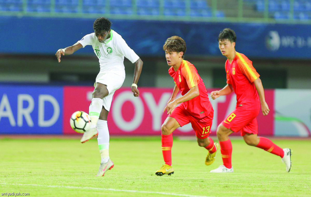 صورة التقطت أمس لفرج الغشيان لاعب المنتخب السعودي للشباب يسدد الكرة وسط مطاردة من لاعبين من المنتخب الصيني (المركز الإعلامي ـ اتحاد القدم)