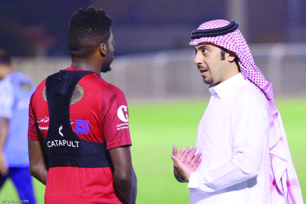 صورة التقطت أمس لمساعد الزامل يتحدث إلى برناوي بعد نهاية الاجتماع (المركز الإعلامي ـ القادسية)
