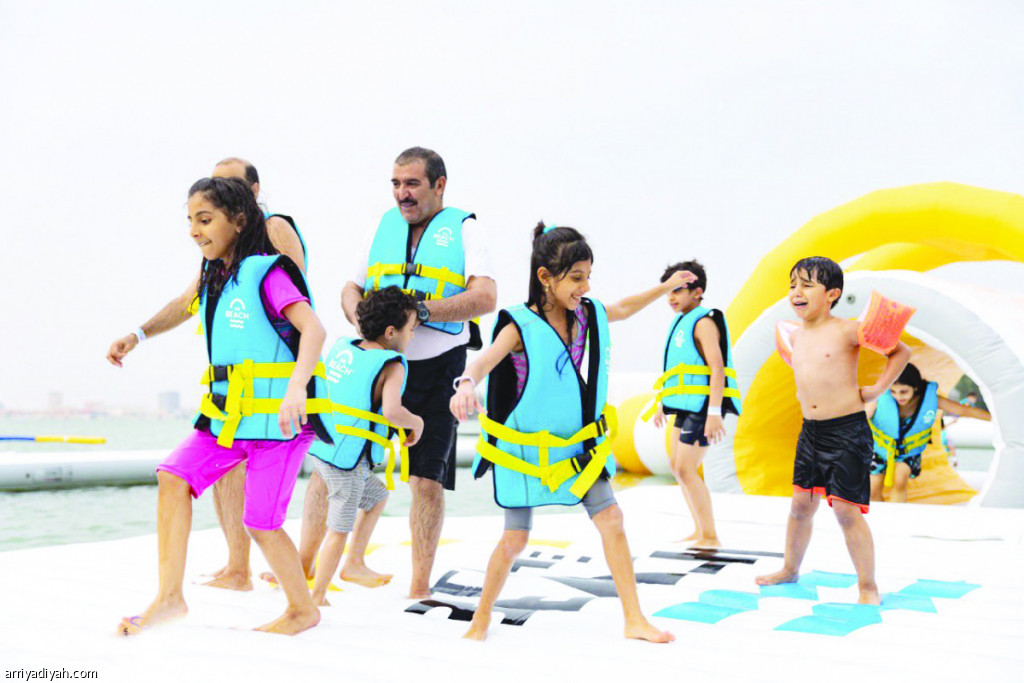 والحصول على شهادة أكبر جزيرة مائية عائمة في العالم، حيث صُممت الجزيرة المائية من خلال مضمار ضخم للحواجز يقع في شاطئ الغروب في مدينة الخبر، ليشكل ألواحاً فنية وجمالية، ويمكن للمضمار الذي يبلغ طوله 145 متراً وعرضه 66 متراً استيعاب ما يصل إلى 1000 شخص دفعة واحدة على مساحة 20.536 م2 وتضم 75 لعبة.