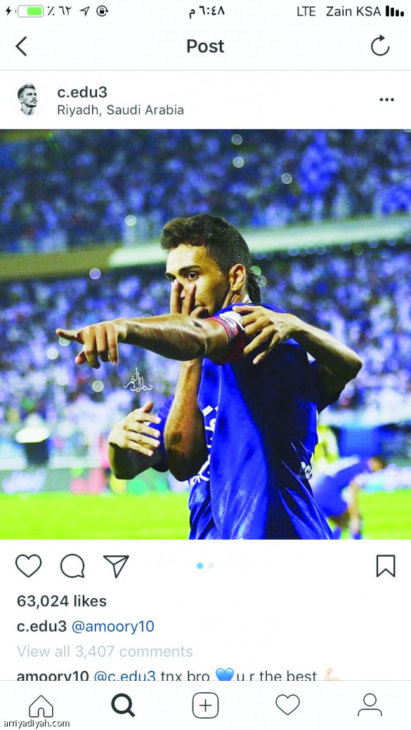 تفوَّق البرازيلي إدورادو، والسوري عمر السومة، محترفا الهلال والأهلي، على حسابَي نادييهما في موقع التواصل الاجتماعي إنستجرام، مساء أمس، ببثهما فرحة الفوز على الاتحاد والفتح على التوالي، أمس الأول، ضمن منافسات دوري كأس محمد بن سلمان للمحترفين.