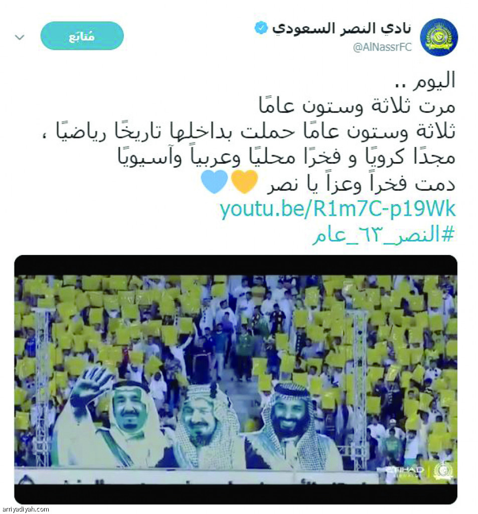 وجاء ثانيًا حساب النصر بعد نشره فيديو يحكي قصة 63 عامًا على تأسيس النادي العاصمي بعنوان "63 عامًا من المجد والفخر"، وكان الأكثر تفاعلاً بنحو 207 آلاف مشاهدة و8700 ريتويت، وبلغ مجموع التفاعل 33.241 ريتويتًا. فيما اقتصرت تغريدات حسابات الشباب والأهلي والاتحاد والوحدة على نتائج المباريات وصور التمارين اليومية خلال الأسبوع الماضي.