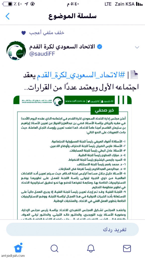 بث حساب الاتحاد السعودي لكرة القدم عبر موقع التواصل الاجتماعي تويتر أول قرارات وتعيينات المجلس الجديد تحت قيادة قصي الفواز رئيس الاتحاد، وشهدت التغريدة انتشارًا واسعًا في منصات التواصل الاجتماعي وبين الجماهير الرياضية لمعرفة أسماء وأعضاء الاتحاد الجديد.