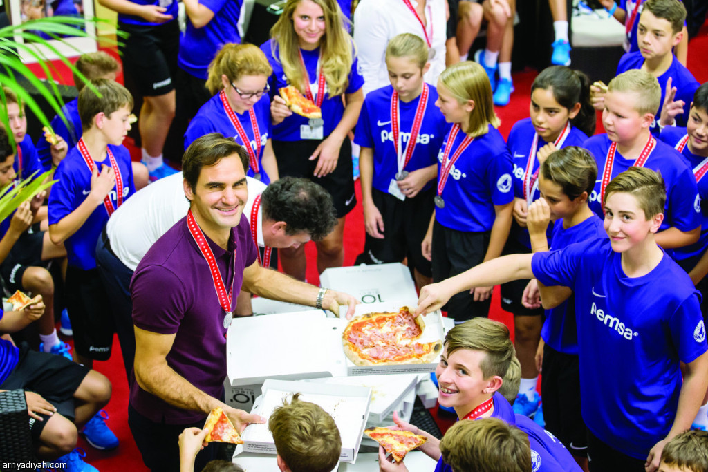 صورة التقطت أمس للسويسري روجر فيدرير لاعب كرة المضرب والمصنف الثالث عالميا يتناول قطعة من البيتزا مع الأطفال جامعي الكرات بعد فوزه على الروماني ماريوس كوبيل ليتوج بلقب بطولة بازل للتنس ويحقق لقبه رقم 99 في مسيرته أمام جماهير بلاده في المدينة السويسرية (الأوروبية)