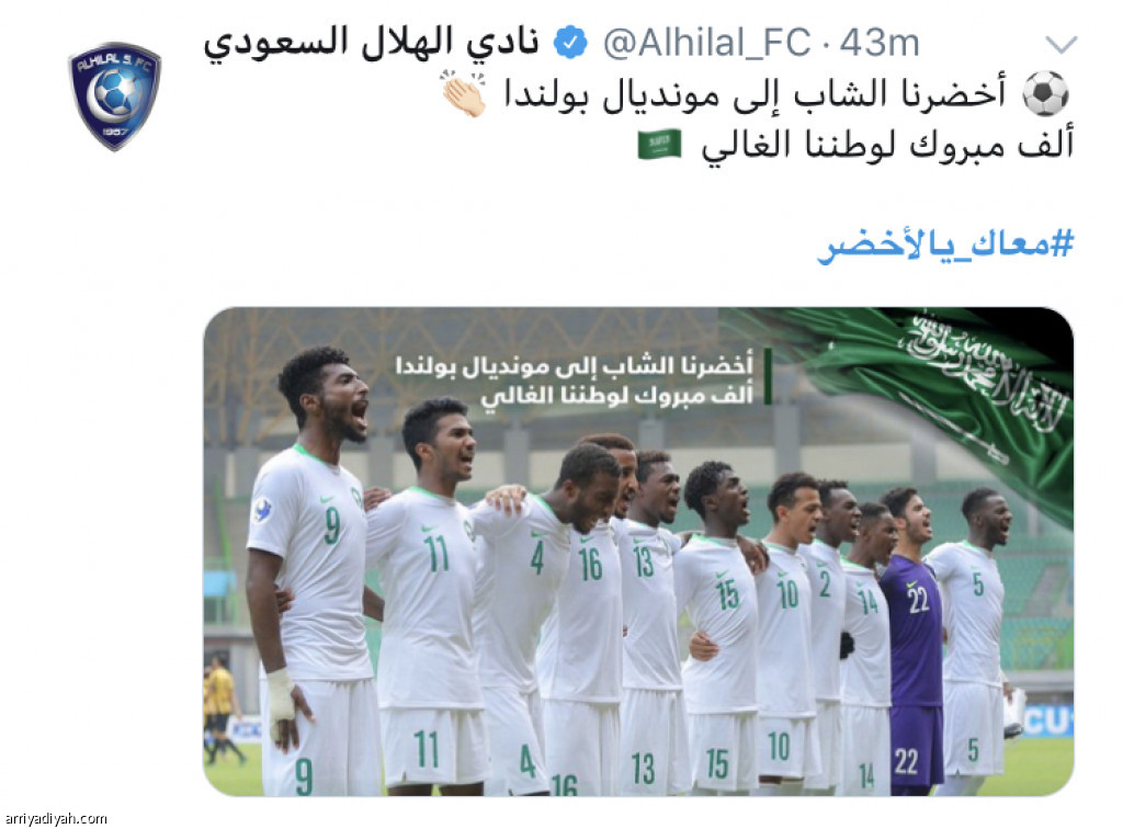 تفاعلت جميع أندية دوري كأس محمد بن سلمان للمحترفين مع الإنجاز الذي حققه المنتخب السعودي بالتأهل إلى نهائيات كأس العالم للشباب التي ستقام في بولندا العام المقبل عقب فوزه على نظيره الأسترالي بثلاثة أهداف مقابل هدف واحد في ربع نهائي بطولة آسيا تحت 19 عاماً أمس، بتغريدات عبر حساباتها في “تويتر”، باركت من خلالها الإنجاز.