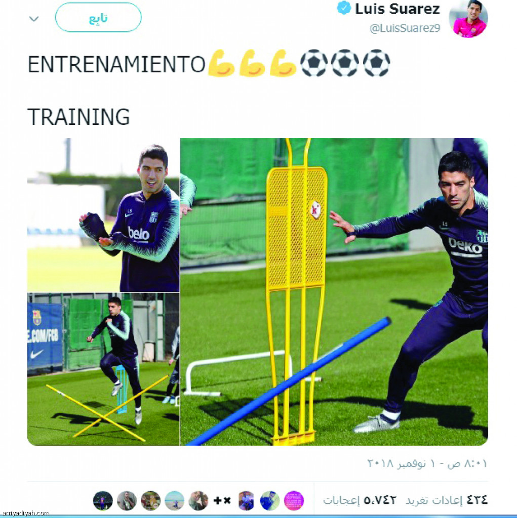 ونشر سواريز أمس على حسابه على تويتر، ثلاث صور له خلال التدريبات، وعلق عليها قائلاً: "التدريبات"، وأرفق معها صورة تعبيرية لثلاث كرات وثلاث أياد متحدية، في إشارة إلى ثلاثيته الأخيرة أمام ريال مدريد.