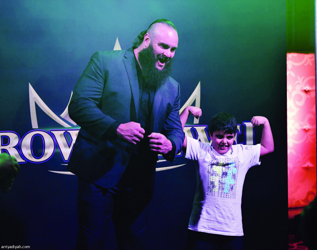 صورة التقطت لسترومان بطل أعظم رويال رامبل مع أحد الأطفال خلال حفل العشاء الذي أعدته اللجنة المنظمة لبطولة كراون جول للمصارعين المشاركين في الحدث العالمي (المركز الإعلامي ـ هيئة الرياضة)