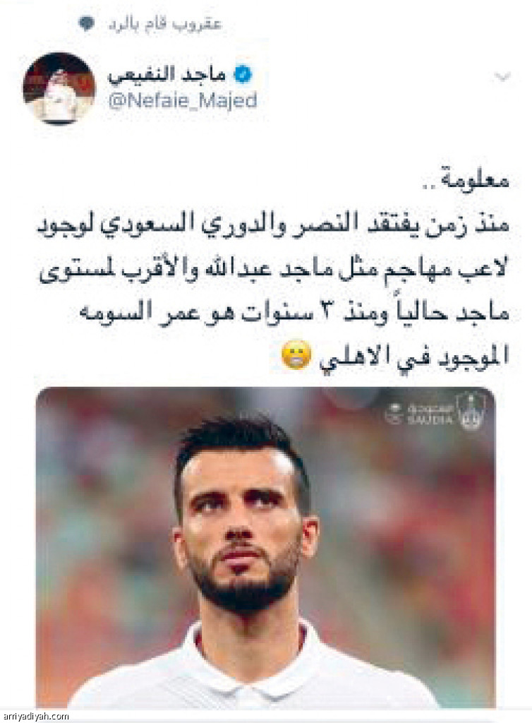 يذكر أن النفيعي غرَّد قائلًا: "معلومة.. منذ زمن يفتقد النصر والدوري السعودي لوجود لاعب مهاجم مثل ماجد عبد الله، والأقرب لمستوى ماجد حاليًّا، ومنذ 3 سنوات، هو عمر السومة الموجود في الأهلي".