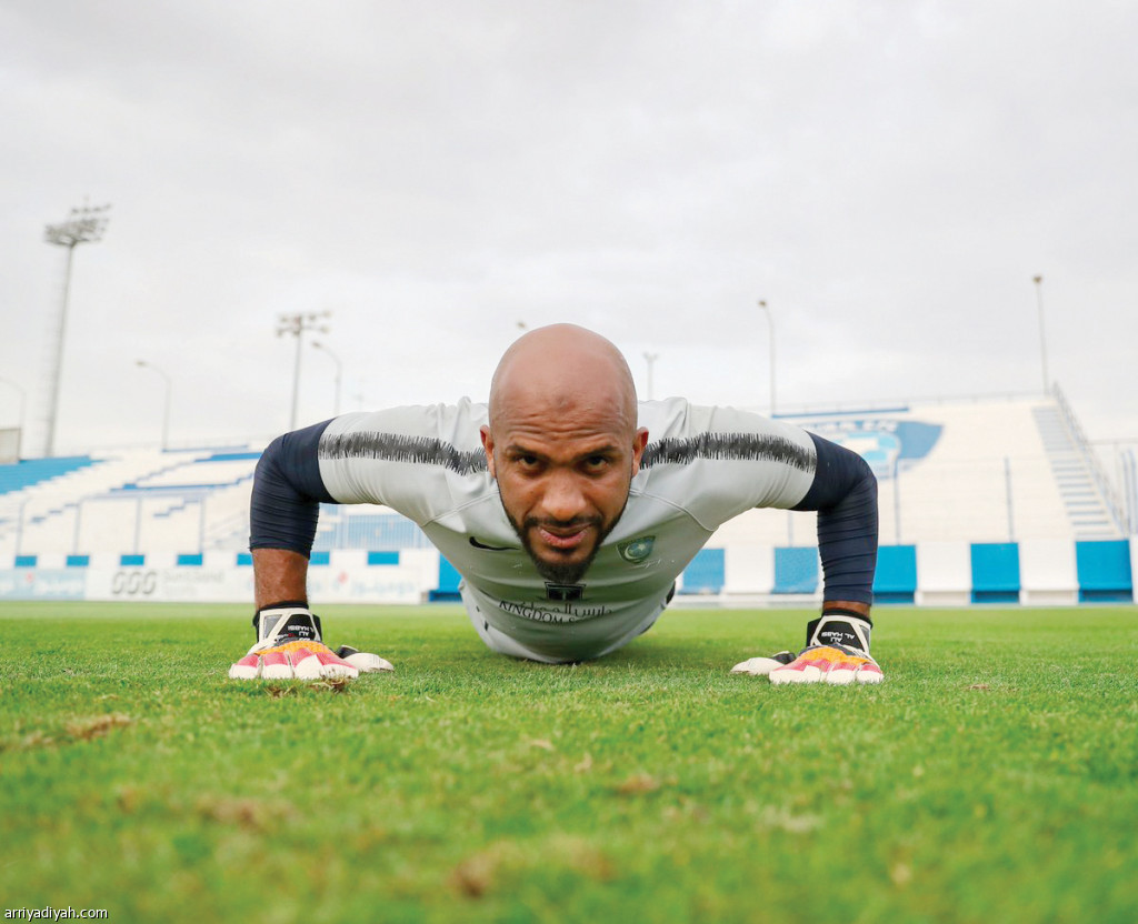 صورة التقطت أمس للعماني علي الحبسي حارس مرمى فريق الهلال الأول لكرة القدم يؤدي تمارين اللياقة ضمن التحضيرات للقاء الاتفاق في المواجهة المؤجلة من الجولة الخامسة لدوري كأس محمد بن سلمان للمحترفين (المركز الإعلامي ـ الهلال)