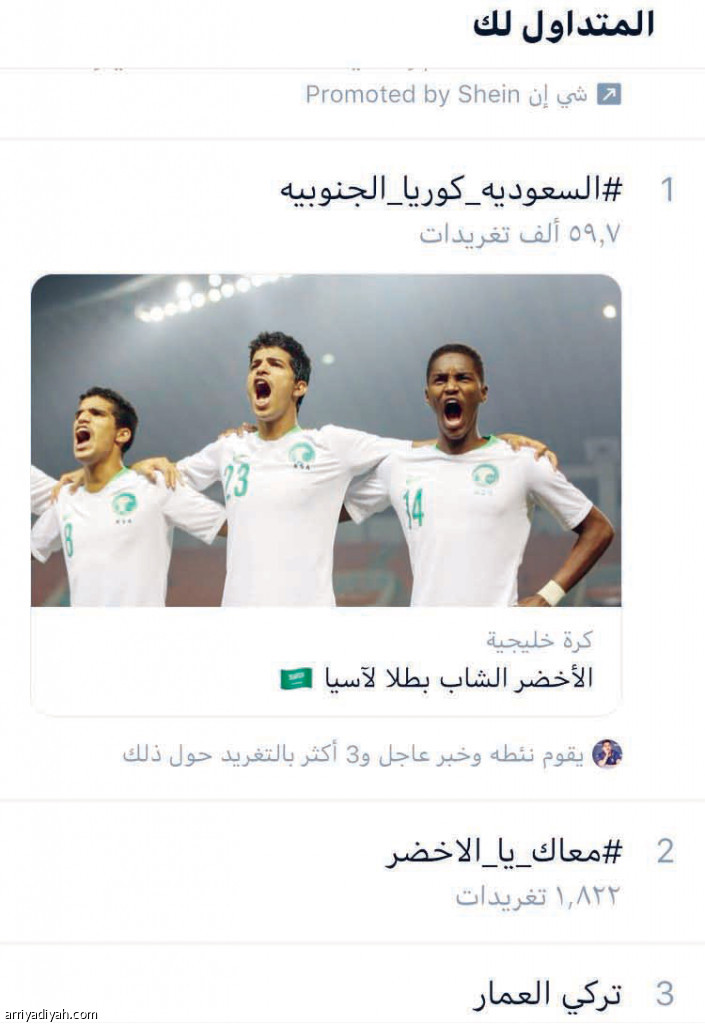 تصدر هاشتاق مباراة #السعوديةكورياالجنوبية على نهائي كأس آسيا تحت سن 19 عاماً والمقامة في إندونيسيا مساء أمس الترند السعودي عبر موقع التواصل الاجتماعي تويتر.