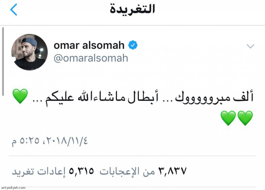 نشر عمر السومة لاعب فريق الأهلي الأول لكرة القدم عبر حسابه الرسمي في موقع التواصل الاجتماعي "تويتر"، تغريدة قدم من خلالها تهنئته للمنتخب السعودي الشاب بعد تحقيقه كأس آسيا تحت 19 عاماً وإلى الجماهير الرياضية السعودية ونالت تغريدة السومة تفاعلاً كبيراً.