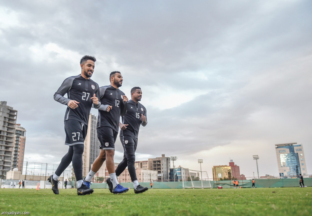 صورة التقطت أمس للثلاثي ناصر الشمراني وهتان باهبري ومحمد سالم، لاعبي فريق الشباب الأول لكرة القدم، يؤدون تدريبات الإحماء قبل انطلاق المران (المركز الإعلامي ـ الشباب)