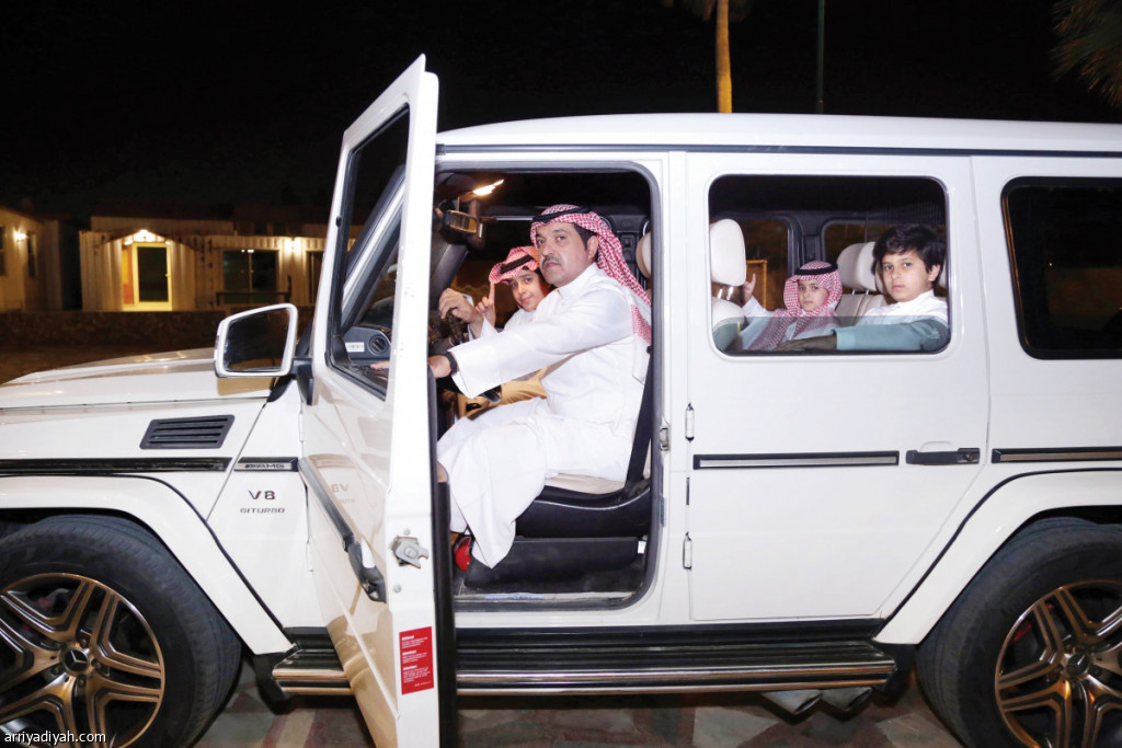 صورة التقطت لفهد الشريع مالك الإبل برفقة أبنائه أثناء استقلالهم مركبته الخاصة في الدمام تصوير: عمران حيدر