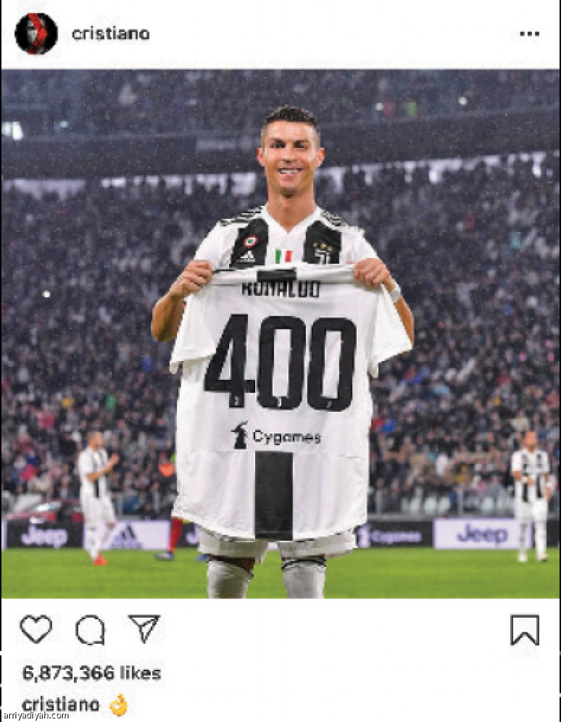 وضع البرتغالي كريستيانو رونالدو، عبر حسابه في موقع التواصل الاجتماعي “إنستجرام” صورة له يحمل قميص يوفنتوس وعليه الرقم 400، بعد أن كرمه ناديه يوفنتوس، ومنحه أندريا أنييلي رئيس نادي يوفنتوس القميص الذي يشير إلى تجاوز كريستيانو الهدف رقم 400 في الدوريات الأوروبية الكبرى التي لعب فيها.